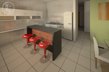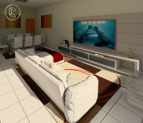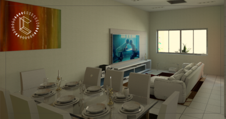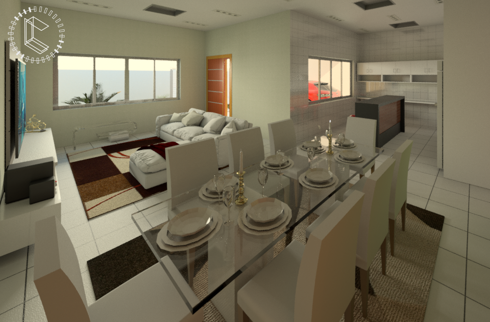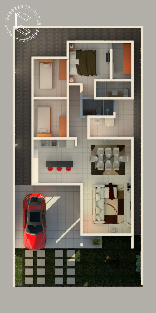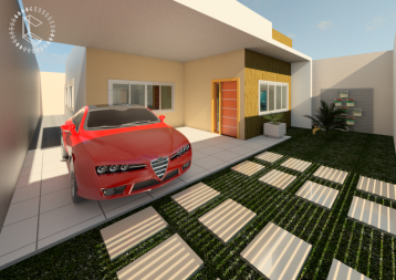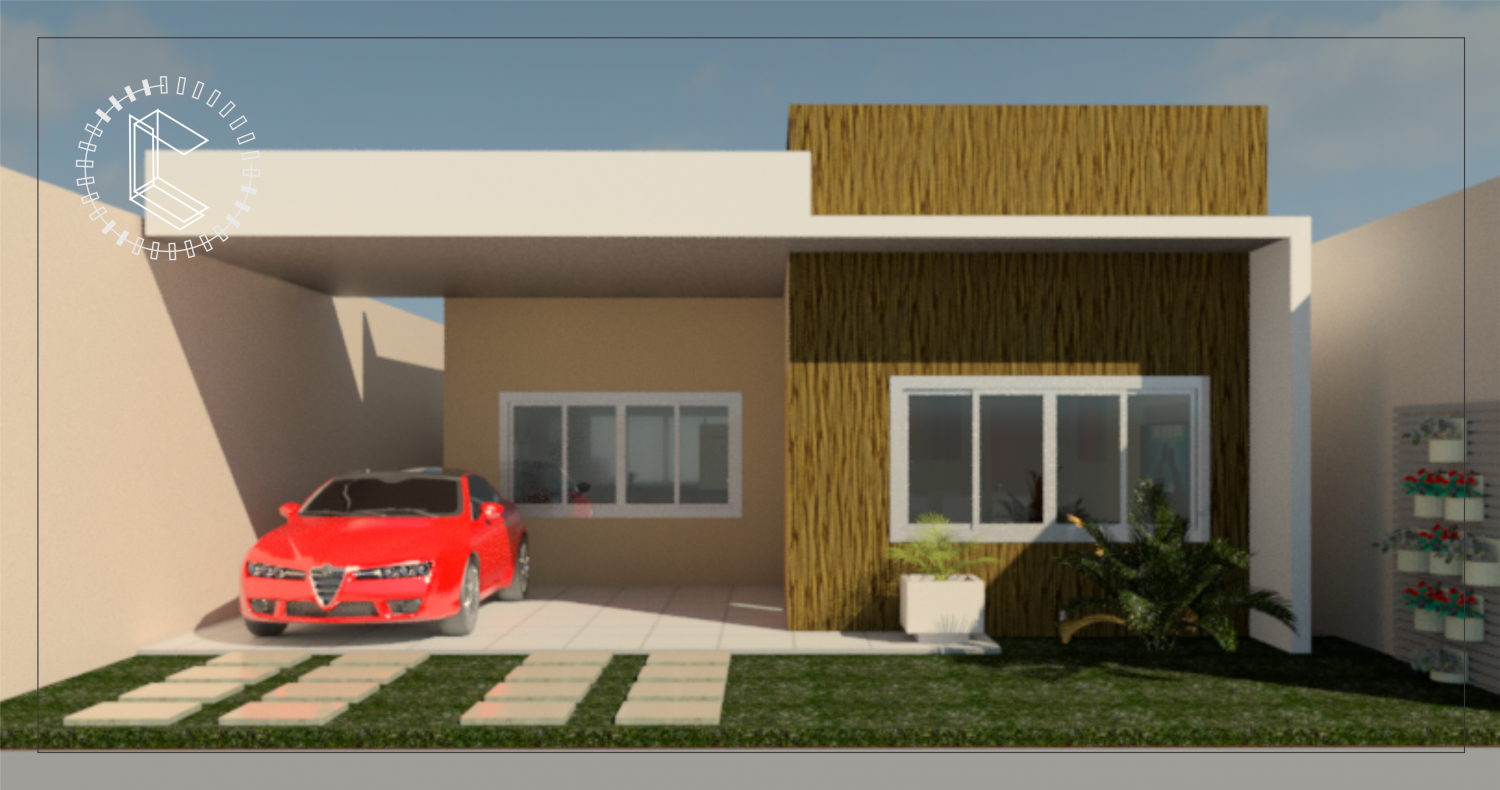 Projeto residencial simples, com suíte, 2 dormitórios, sala de estar, cozinha e sala de jantar integrada e garagem para dois carro.